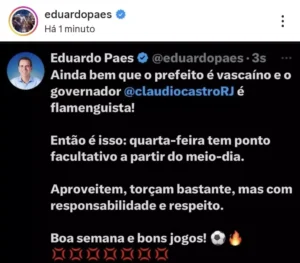 Na publicação, Eduardo Paes também sinalizou a possibilidade de adoção de medida semelhante pelo Governo do Estado, embora não haja confirmação oficial por parte do governador Cláudio Castro (PL).